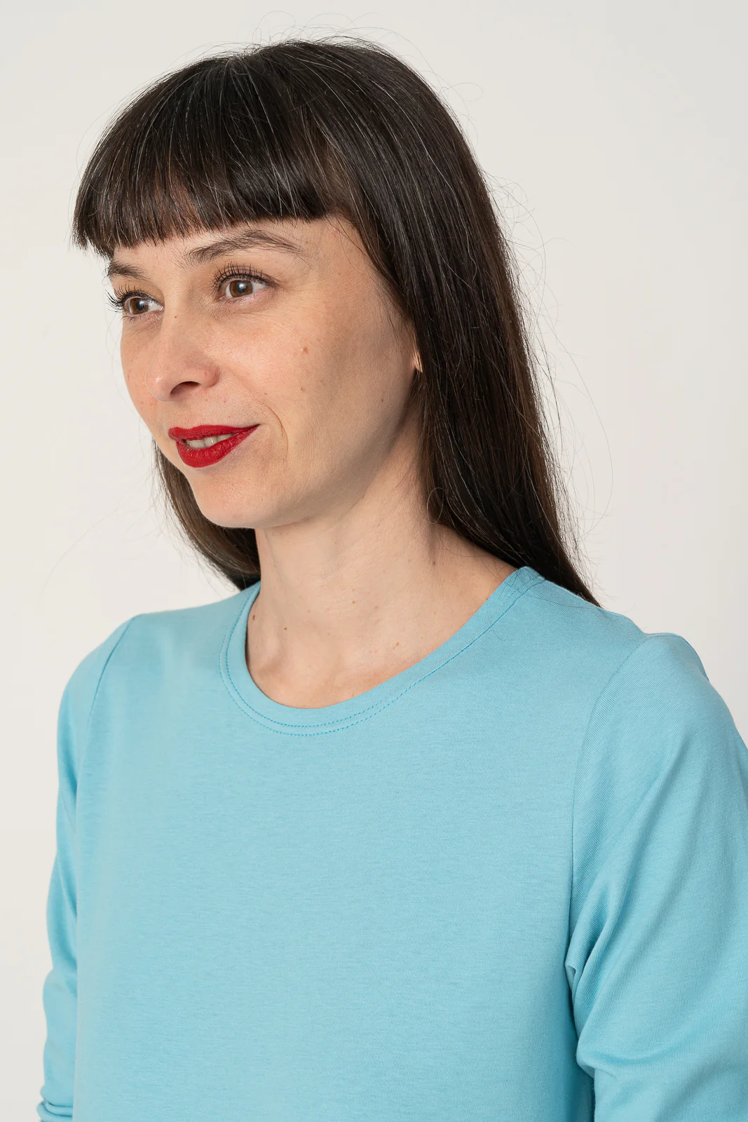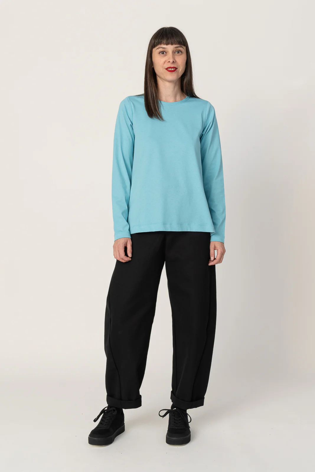 Camiseta evase de manga larga y cuello caja. Muy agradable y cómodo de llevar. Diseñado por Elisa Muresan. Patronaje y confección a mano en Zaragoza en nuestro propio taller.