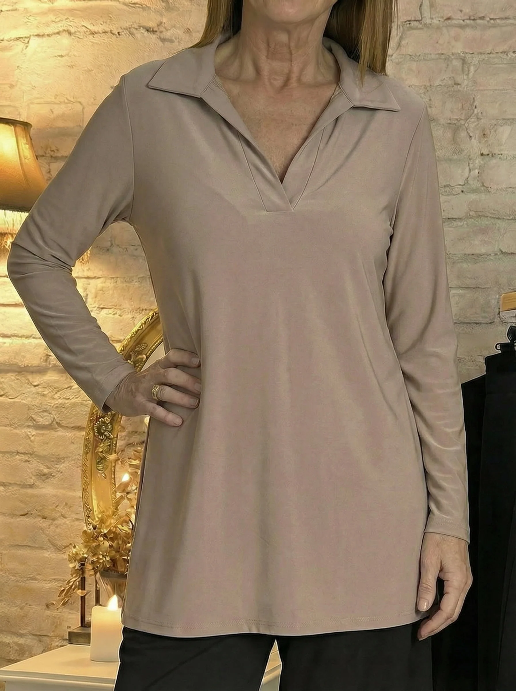 El largo es perfecto para tapar justo lo que queremos — cadera, barriguita — pero sin parecer ancho ni pesado. Te la puedes poner suelta o meter un poquito por dentro si quieres marcar algo más la figura.