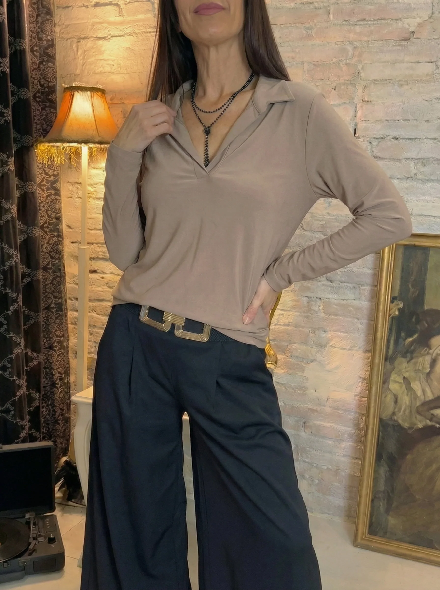 Tiene ese aire elegante sin esfuerzo, gracias al cuello tipo polo con escote en pico, que alarga el cuello y estiliza muchísimo la parte superior. No aprieta nada, pero sienta fenomenal.