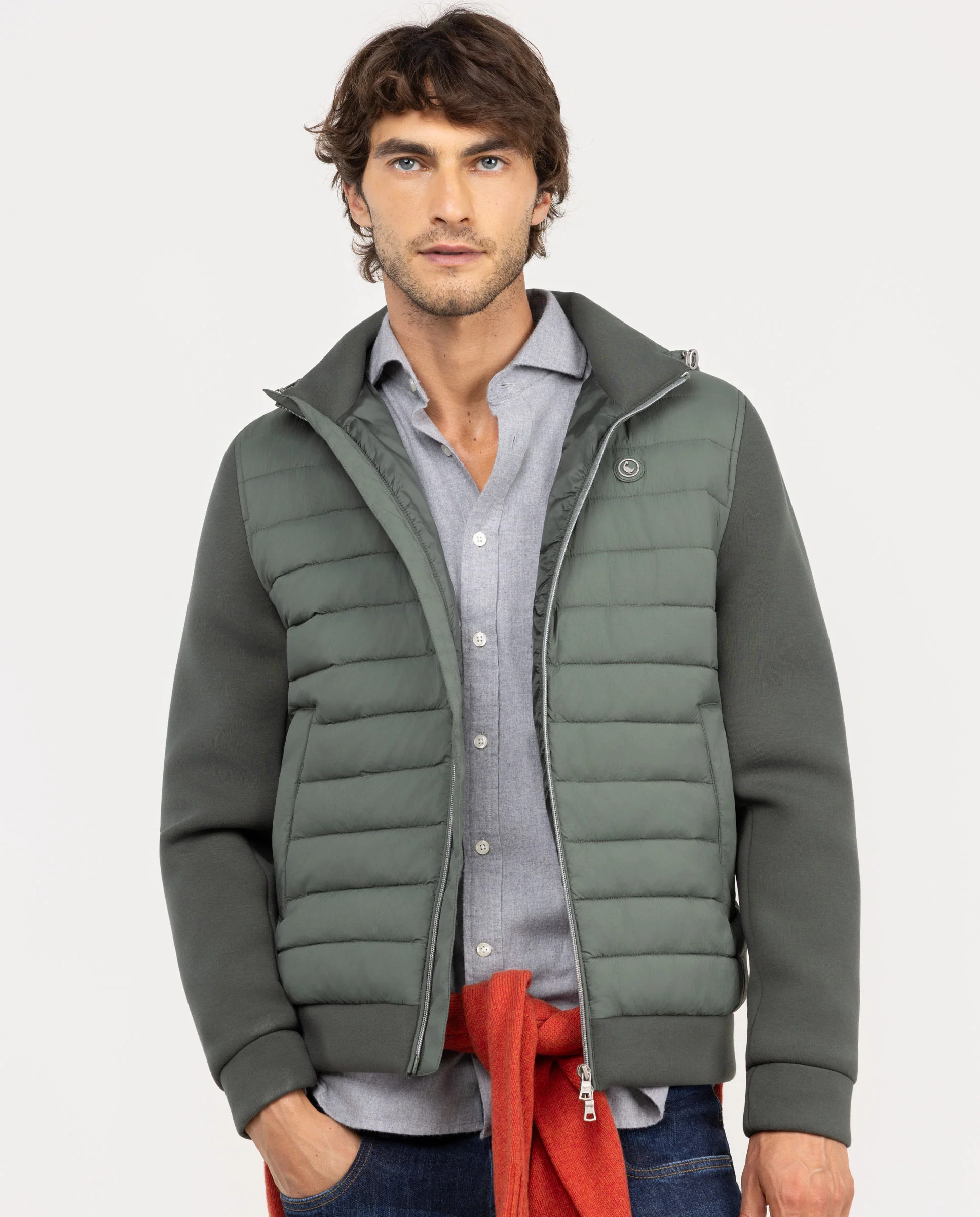 Chaqueta acolchada liso de hombre confeccionado en tejido de nylon reciclado y neopreno en capucha, mangas y bajo. Corte Slim Fit, cierre con cremallera y capucha. Lleva manga larga y bolsillos delanteros inclinados con corchete y bolsillo interior. Detalle de logo metálico en pecho. | REPREVE. En nuestro camino hacia ser una marca 100% sostenible hemos querido usar para el tejido interior, una fibra de alto rendimiento y de última generación, fabricada con todo tipo de materiales reciclados, incluidas las botellas de plástico. Hasta ahora, la empresa ha conseguido reciclar más de 31.000 millones de botellas de plástico y el contador sigue subiendo cada segundo. |