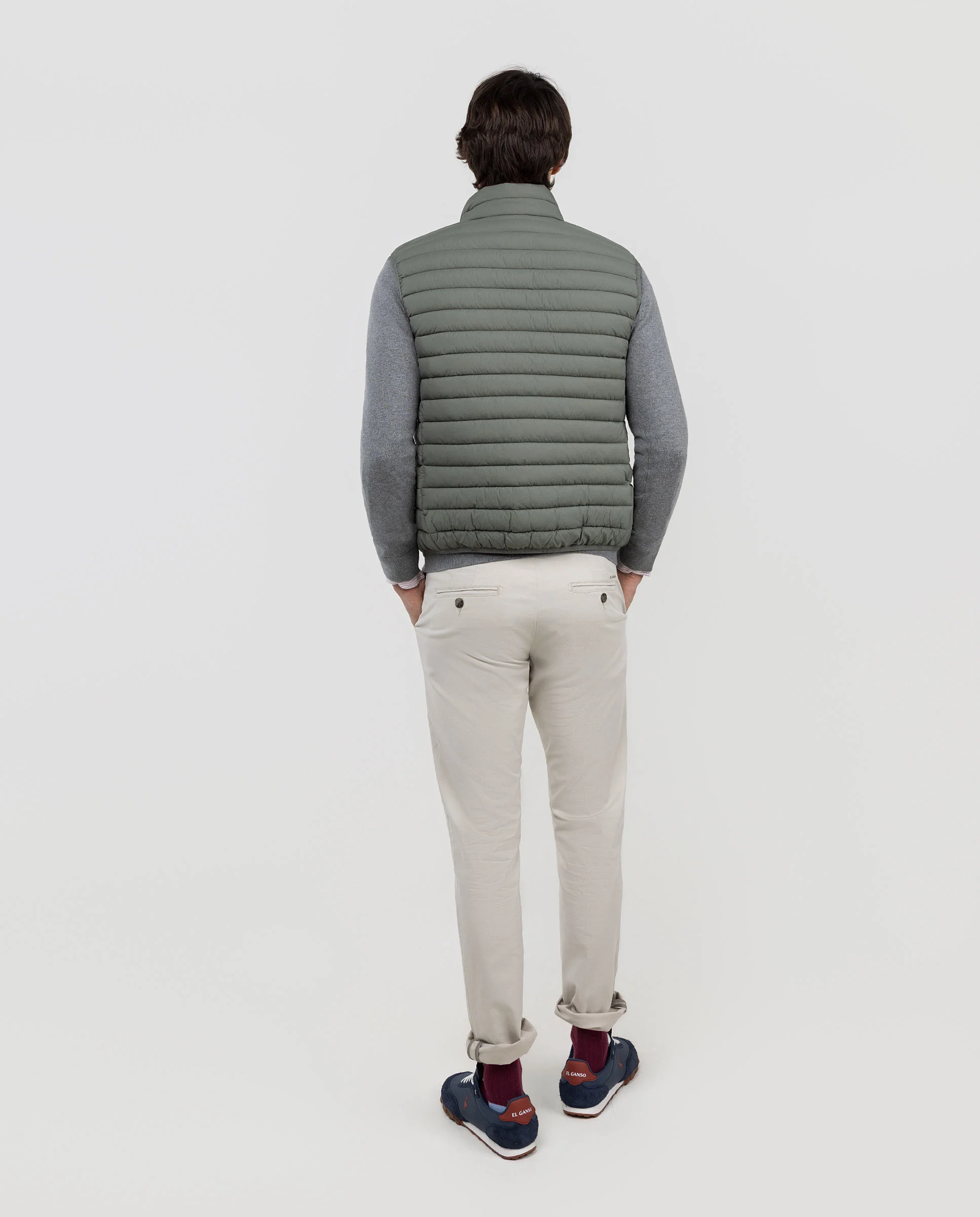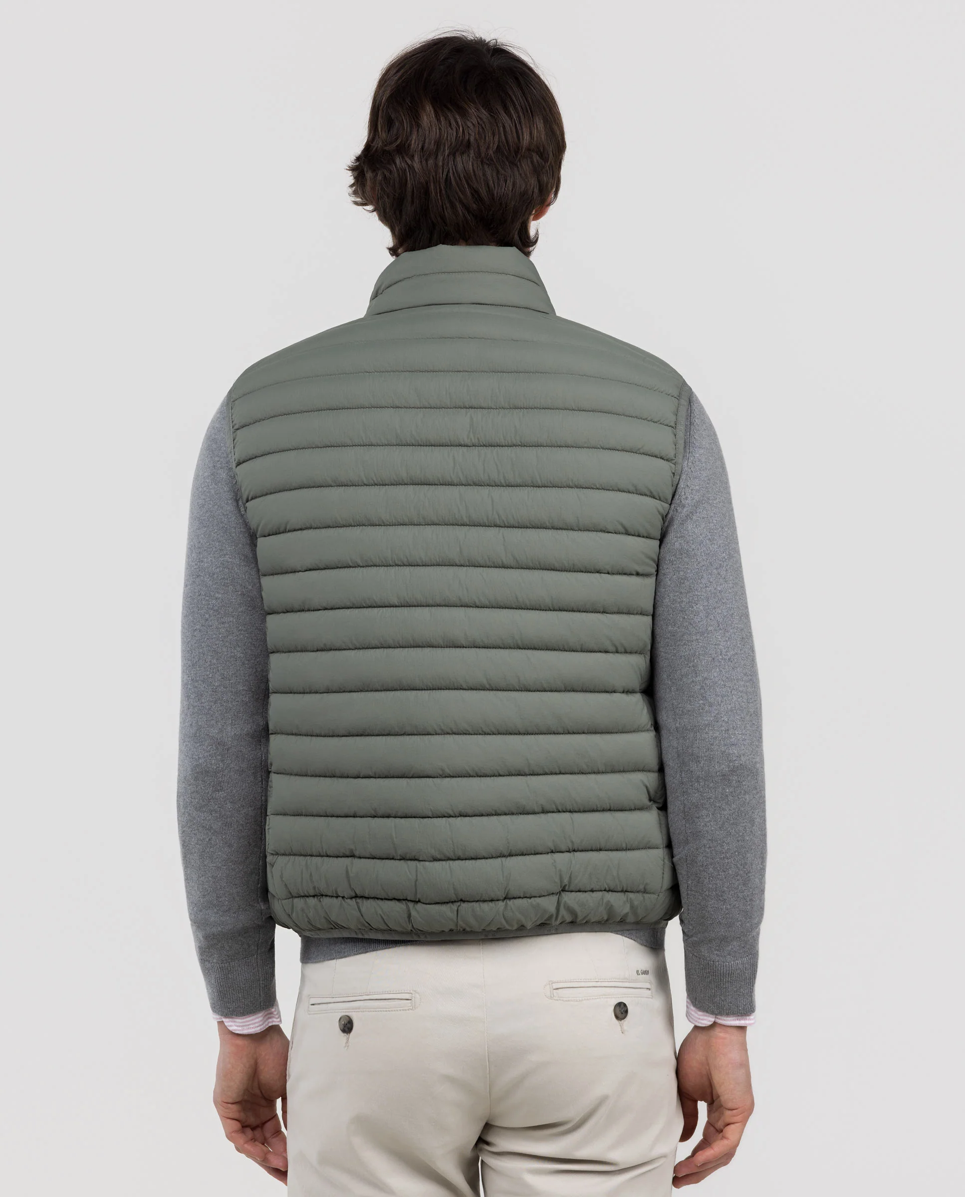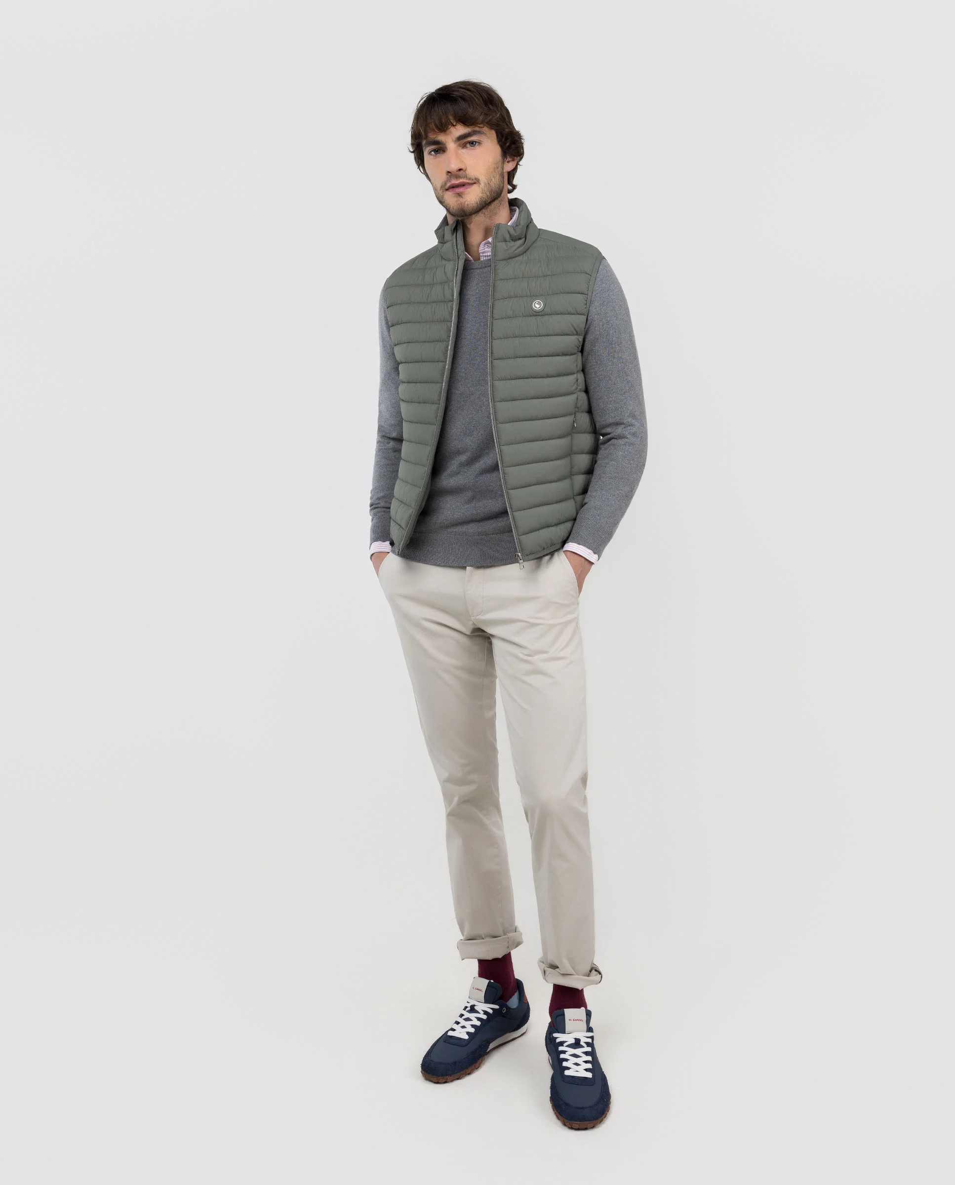 Chaleco de hombre acolchado confeccionado en nylon reciclado, repelente al agua. Cuenta con cremalera y sisa elástica para mayor comodidad. Dispone de bolsillos frontales con cremallera y un bolsillo interior adicional. El logo, con acabado engomado, ubicado en el pecho.