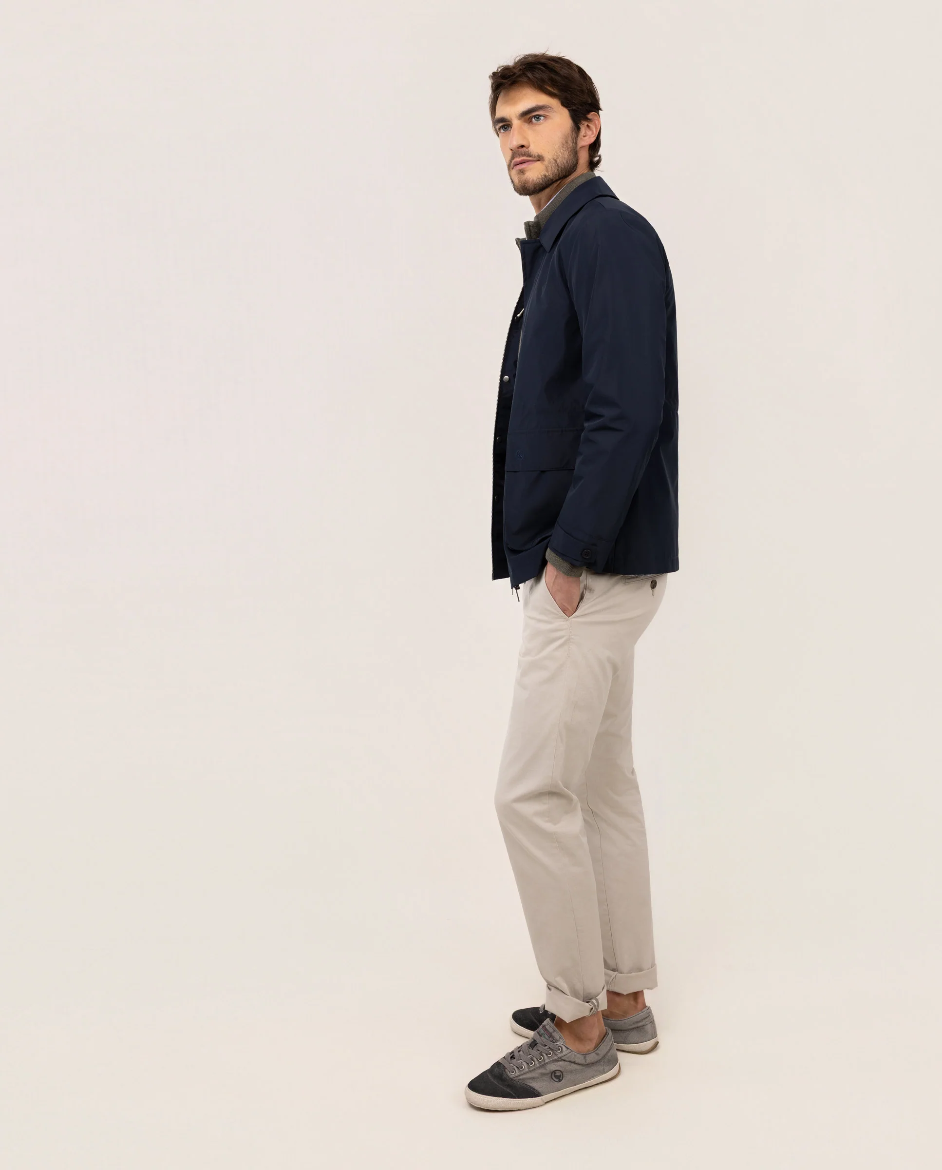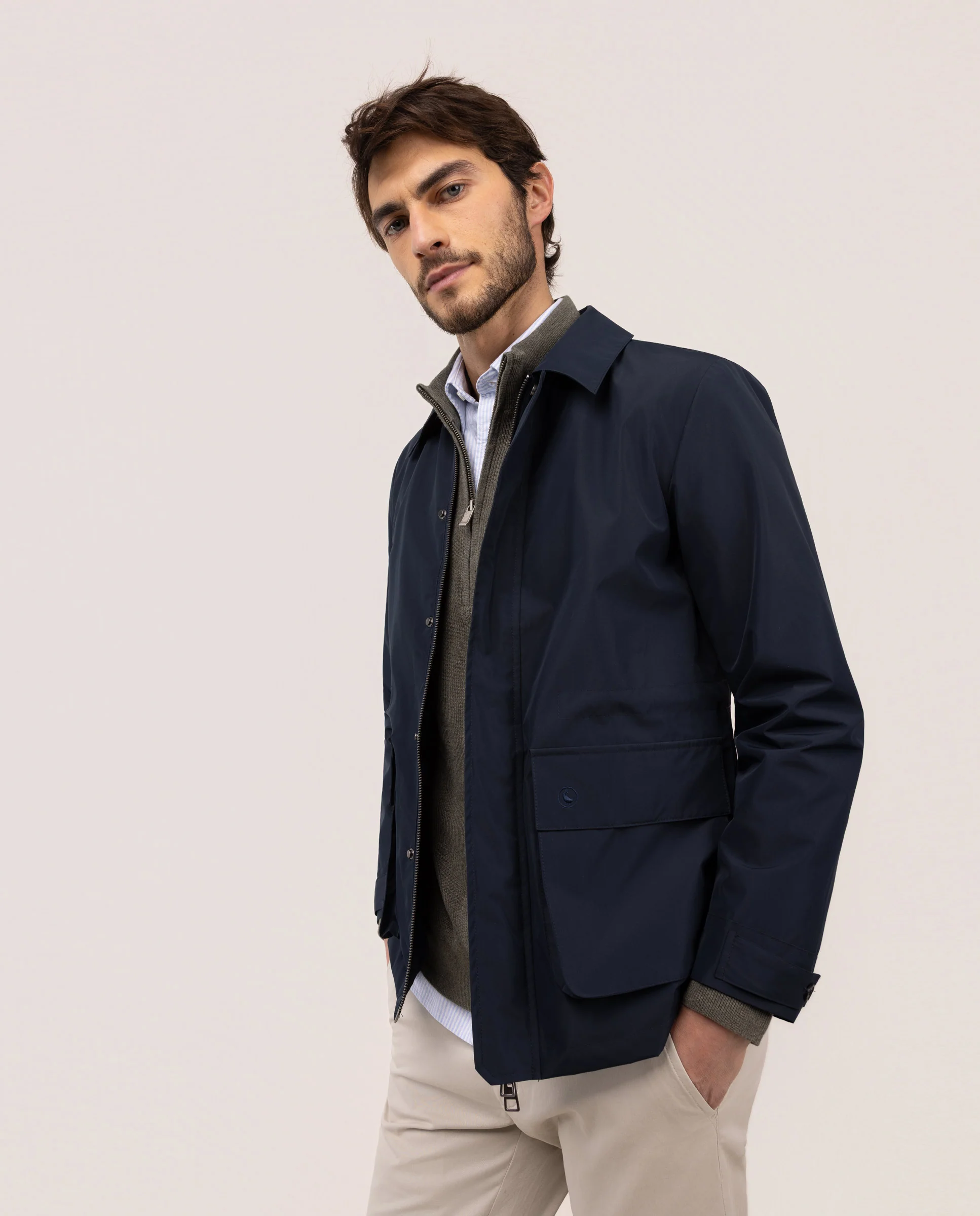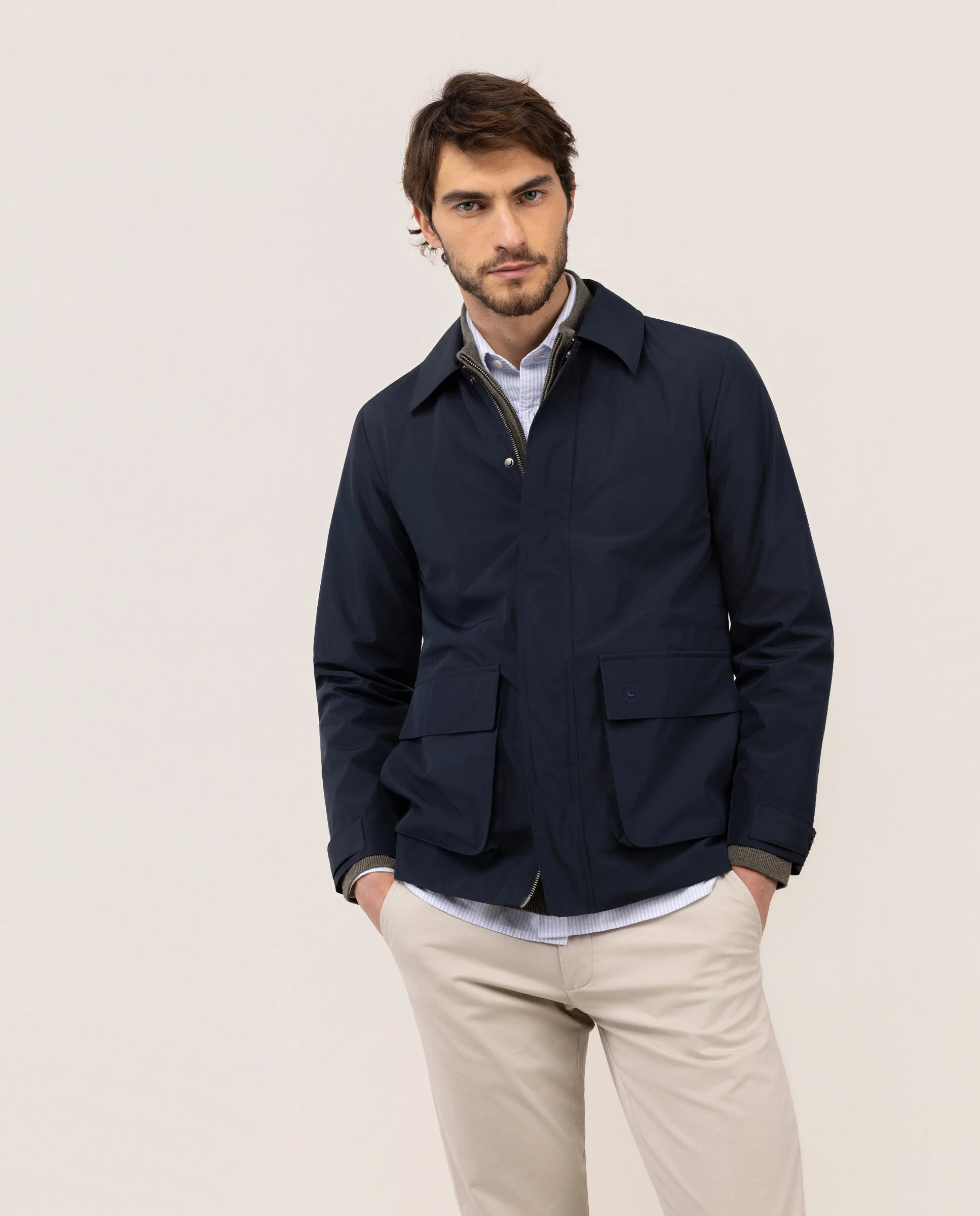 Esta chaqueta ligera es una prenda esencial combinando funcionalidad y estilo en un diseño limpio y contemporáneo. Confeccionada en 100% nylon, ofrece una estructura resistente al viento y de secado rápido.100% nylon técnico, ligero, transpirable y de fácil mantenimiento.Frontal oculto con cremallera y solapa con botones automáticos para una apariencia minimalista. Dos bolsillos frontales amplios con solapa y cierre de botón a presión, y dos bolsillos laterales adicionales para mayor funcionalidad. Corte regular fit.