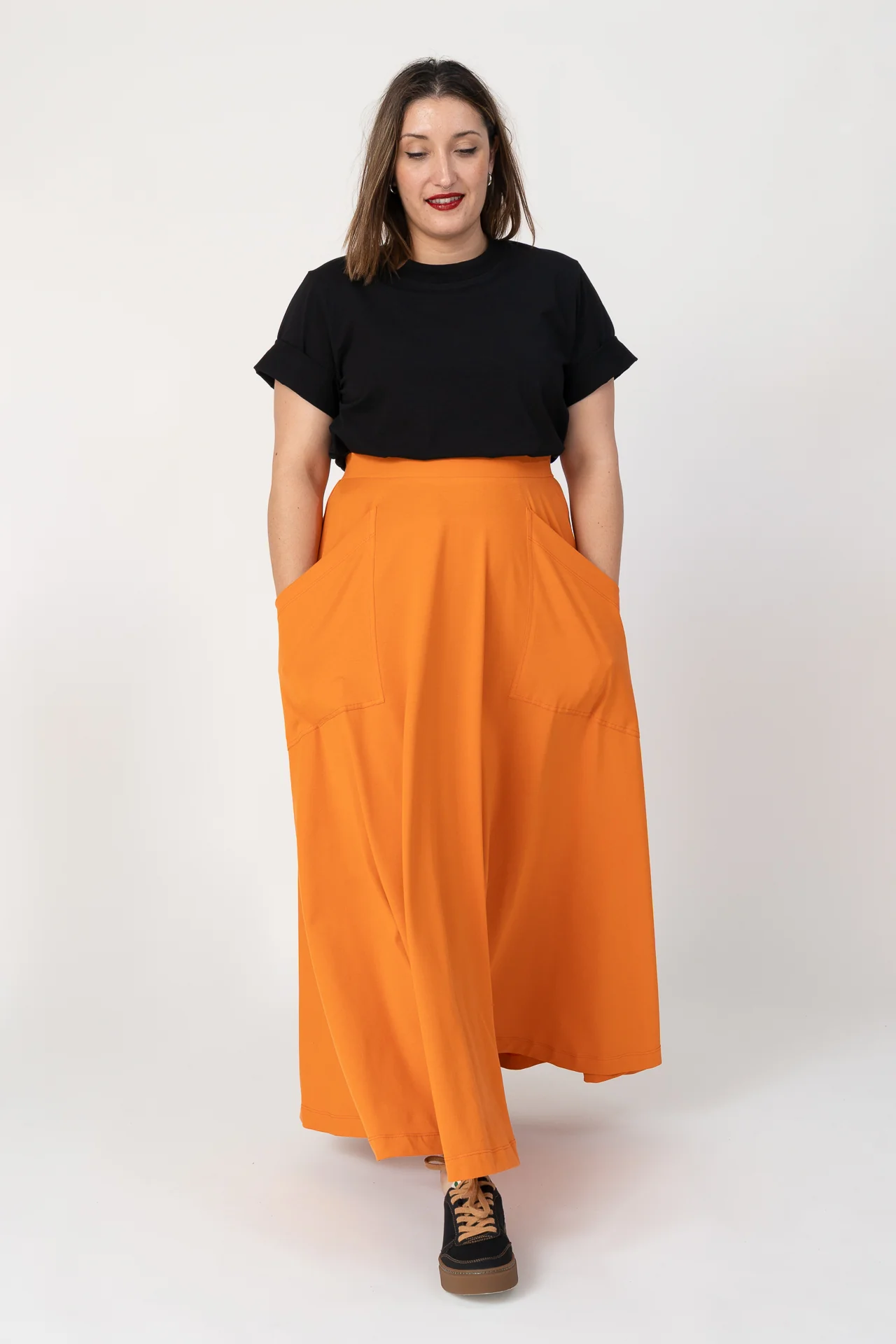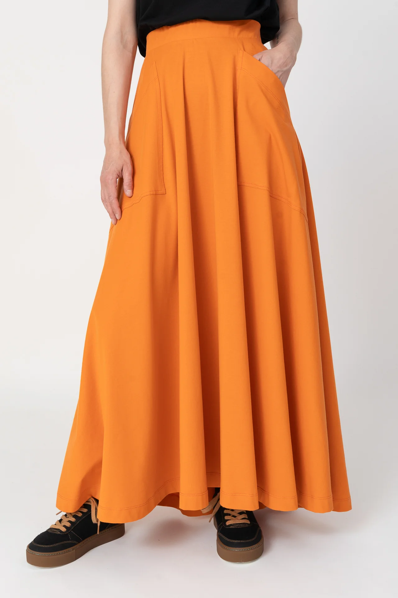 Falda de capa larga con bolsillo de parche diagonal. Muy agradable y cómodo de llevar. Diseñado por Elisa Muresan. Patronaje y confección a mano en Zaragoza en nuestro propio taller.