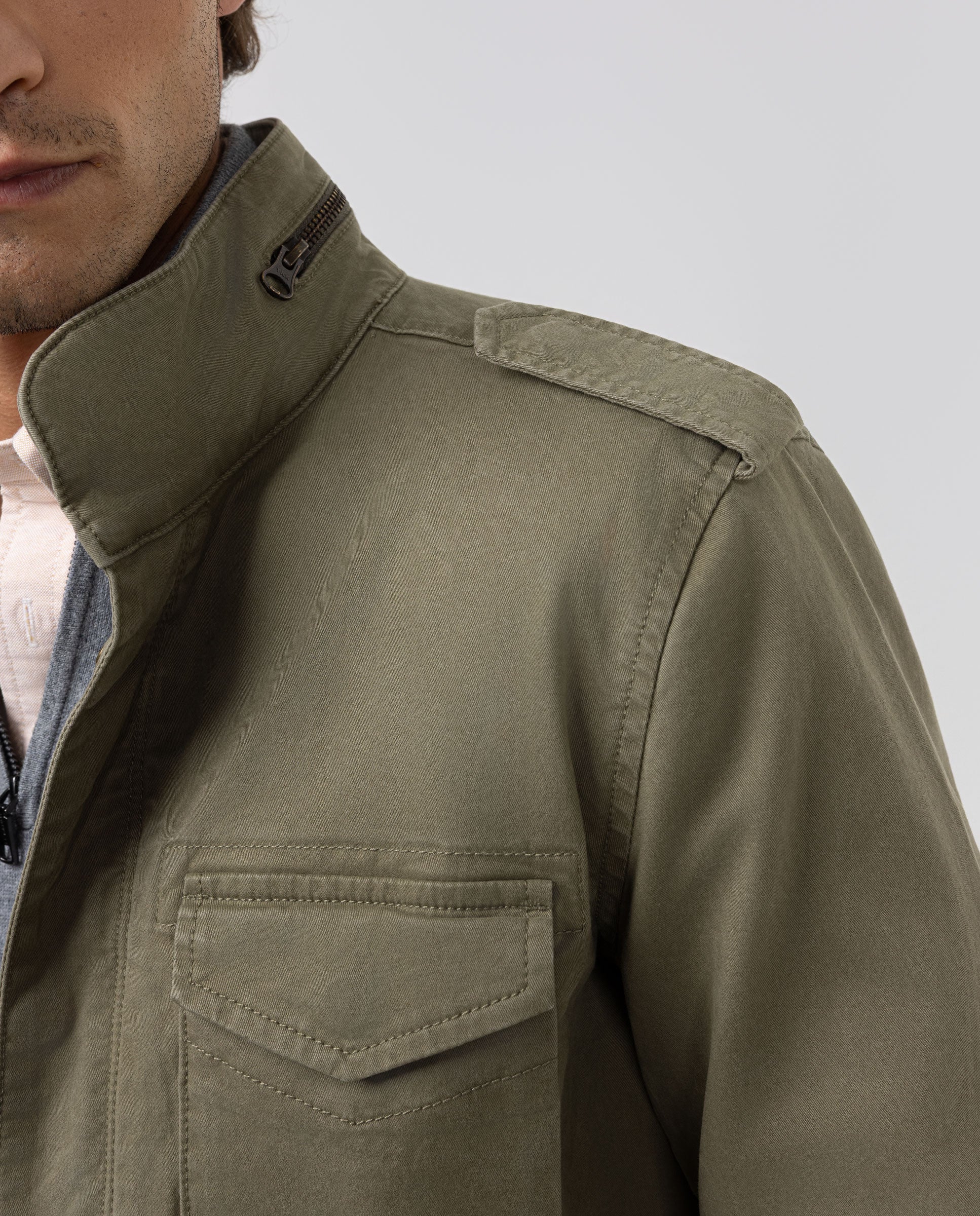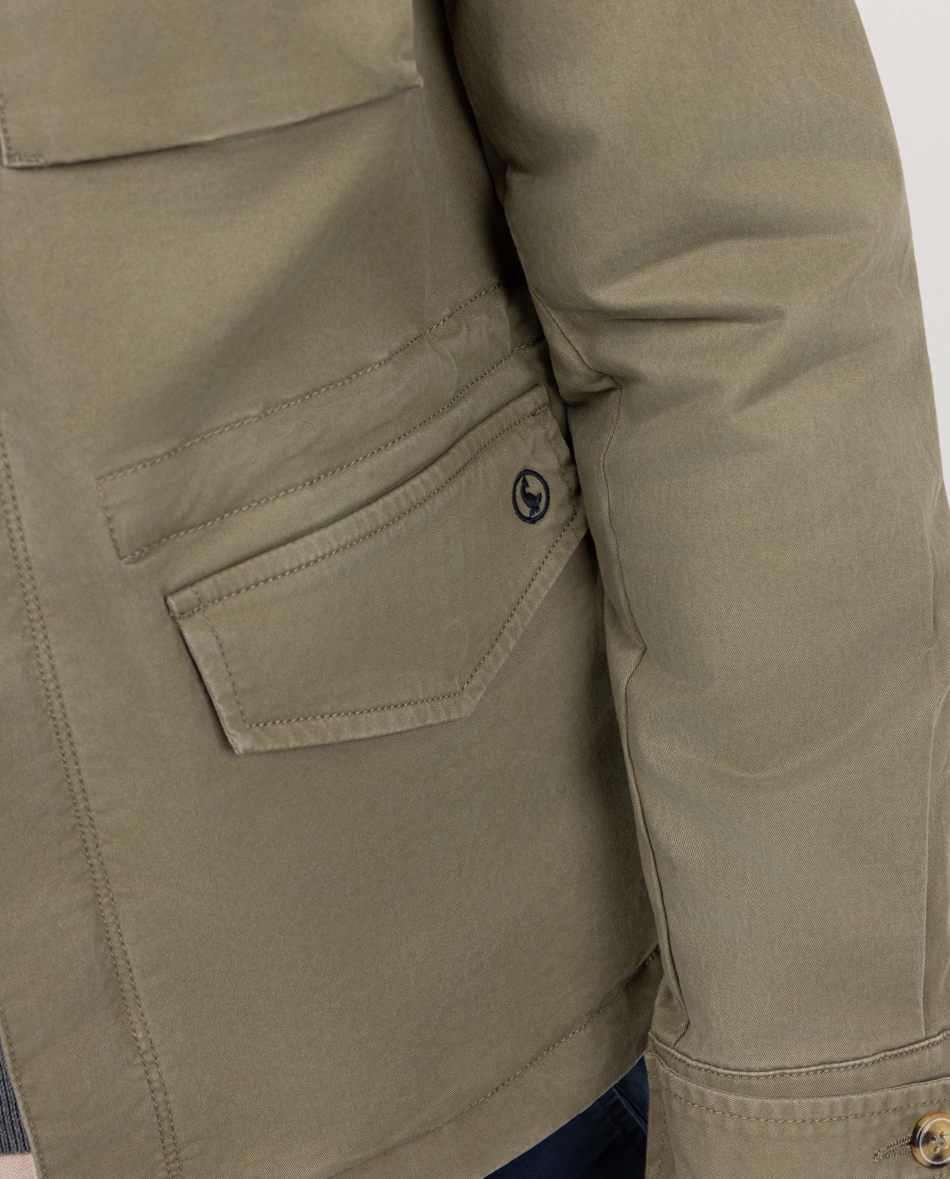 Chaqueta de hombre confeccionada en algodón con elastán para una mayor comodidad. Corte Regular Fit, cuello alto, múltiples bolsillos tipo cargo con tapeta y cierre mediante cremallera oculta por tapeta con botones tipo snap. Manga larga terminada en puño con tira abotonada y cintura ajustable mediante cordón.