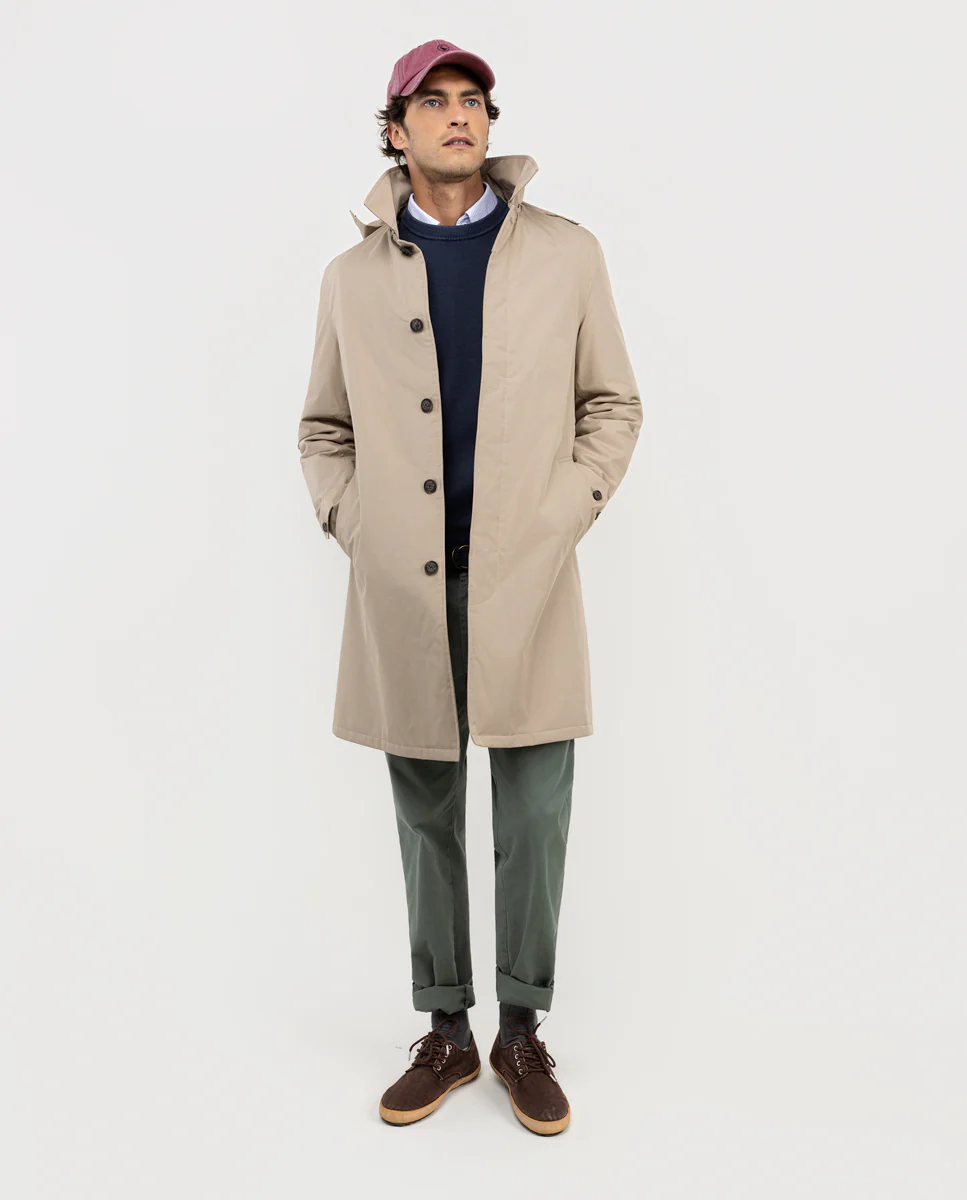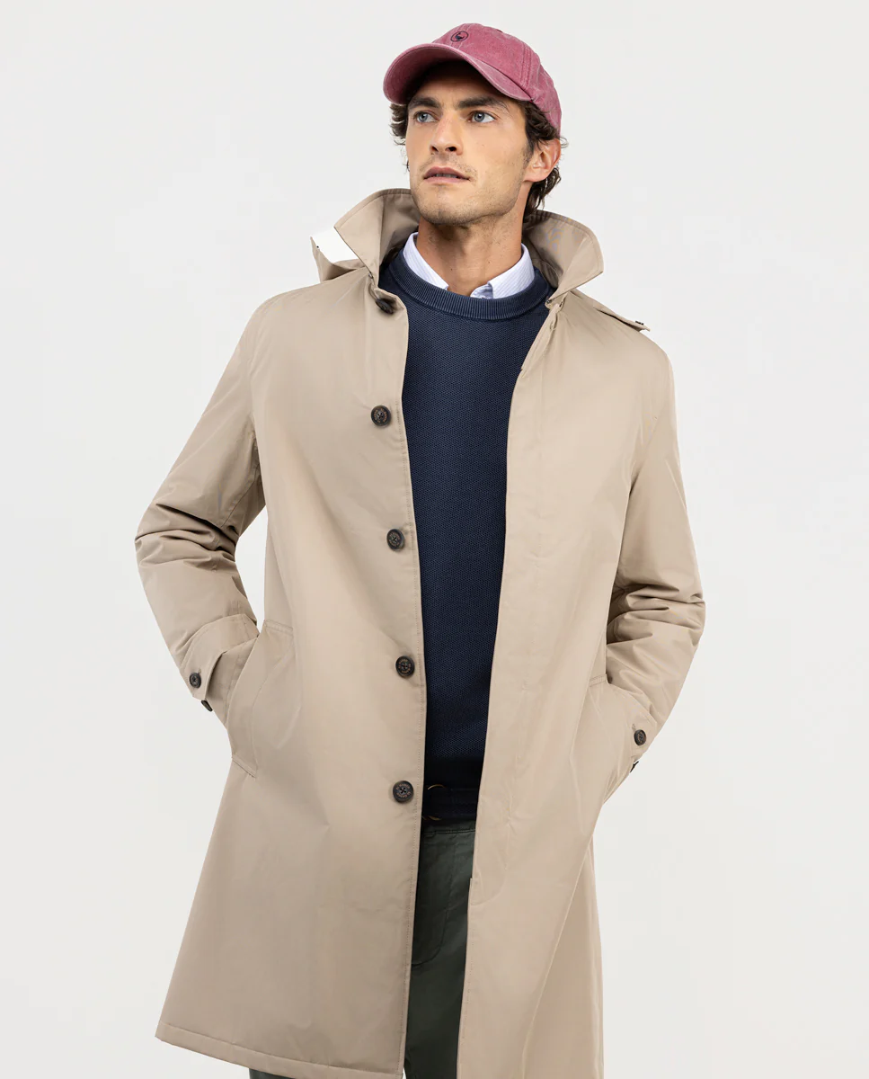 Gabardina de hombre confeccionado en algodón y poliéster reciclado. Tejido repelente al agua. Corte Regular Fit, cuello clásico, capucha desmontable y cierre con botones. Manga larga y dos bolsillos laterales en exterior y uno en el interior. Abertura trasera en el bajo.