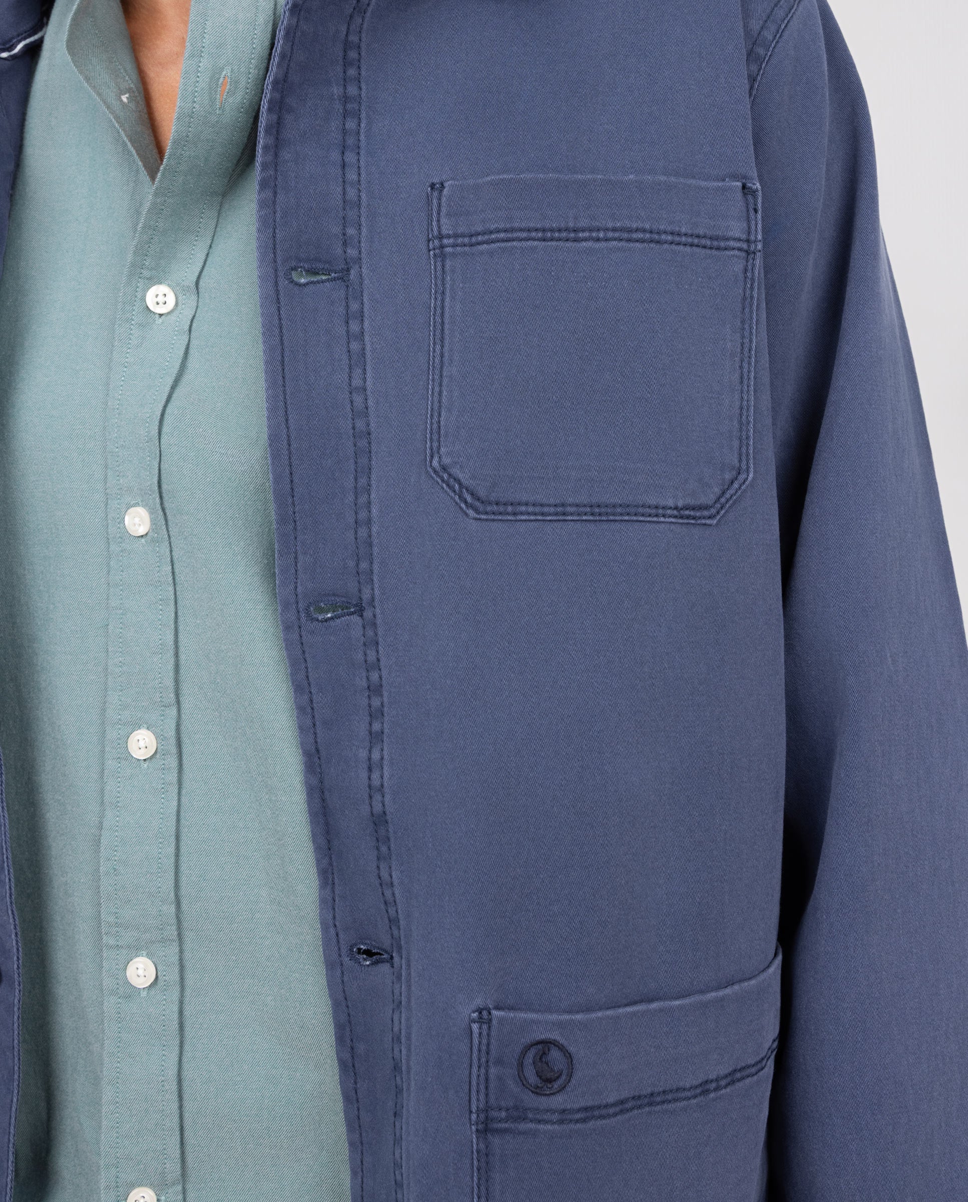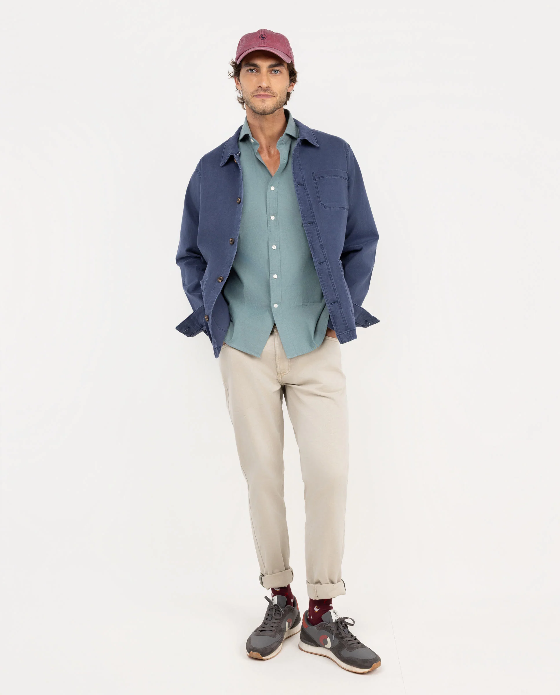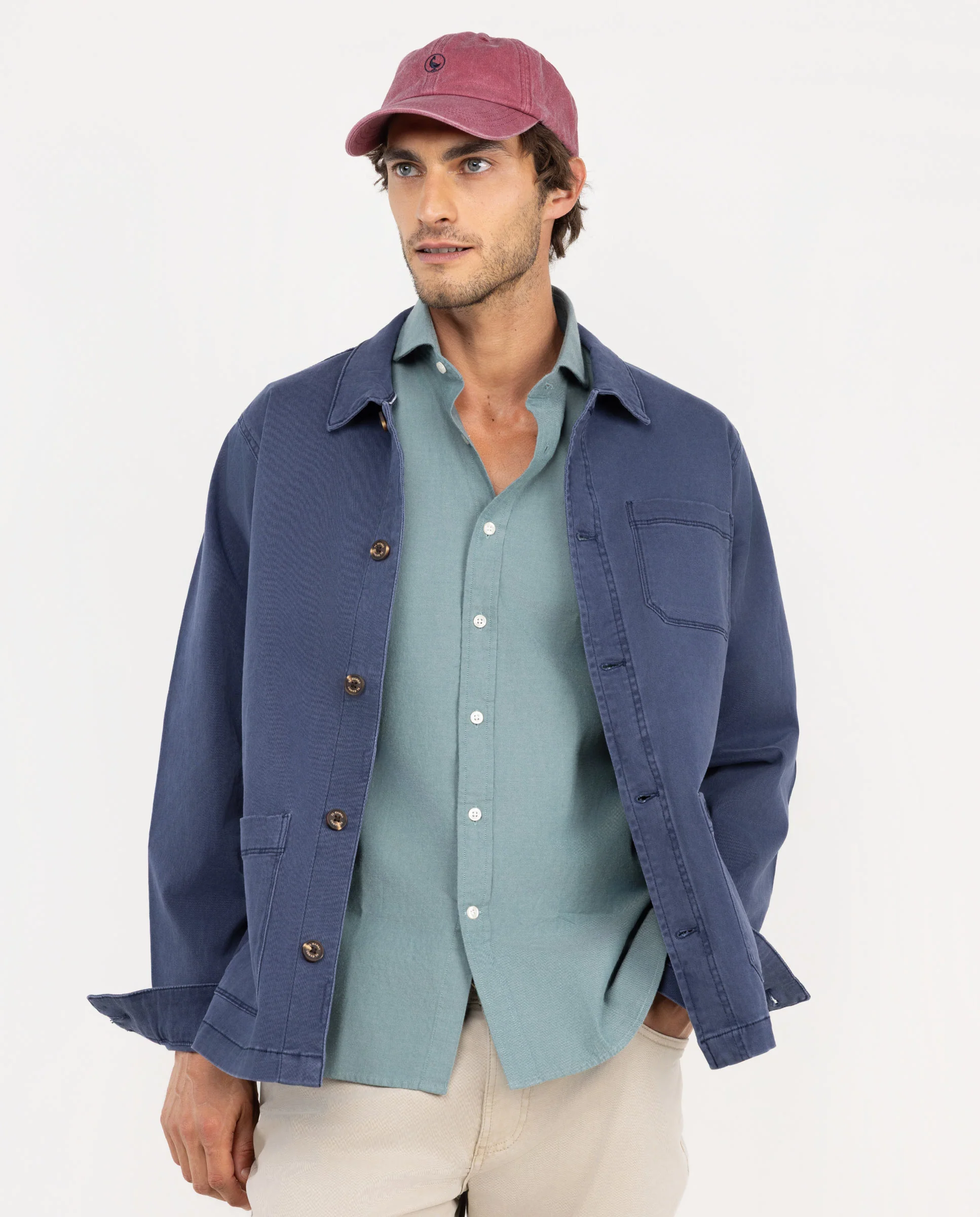 Sobrecamisa de hombre lisa confeccionada en 97% Algodón y 3% Elastano. Corte Regular Fit, cuello clásico, bolsillos tipo parche y cierre con botones. Manga larga y detalle de cinta de 3mm en el borde de la tapilla interior. Lleva logo bordado en uno de los bolsillos de parche. Esta prenda cuenta con un lavado enzimático que le dará un aspecto desgastado.