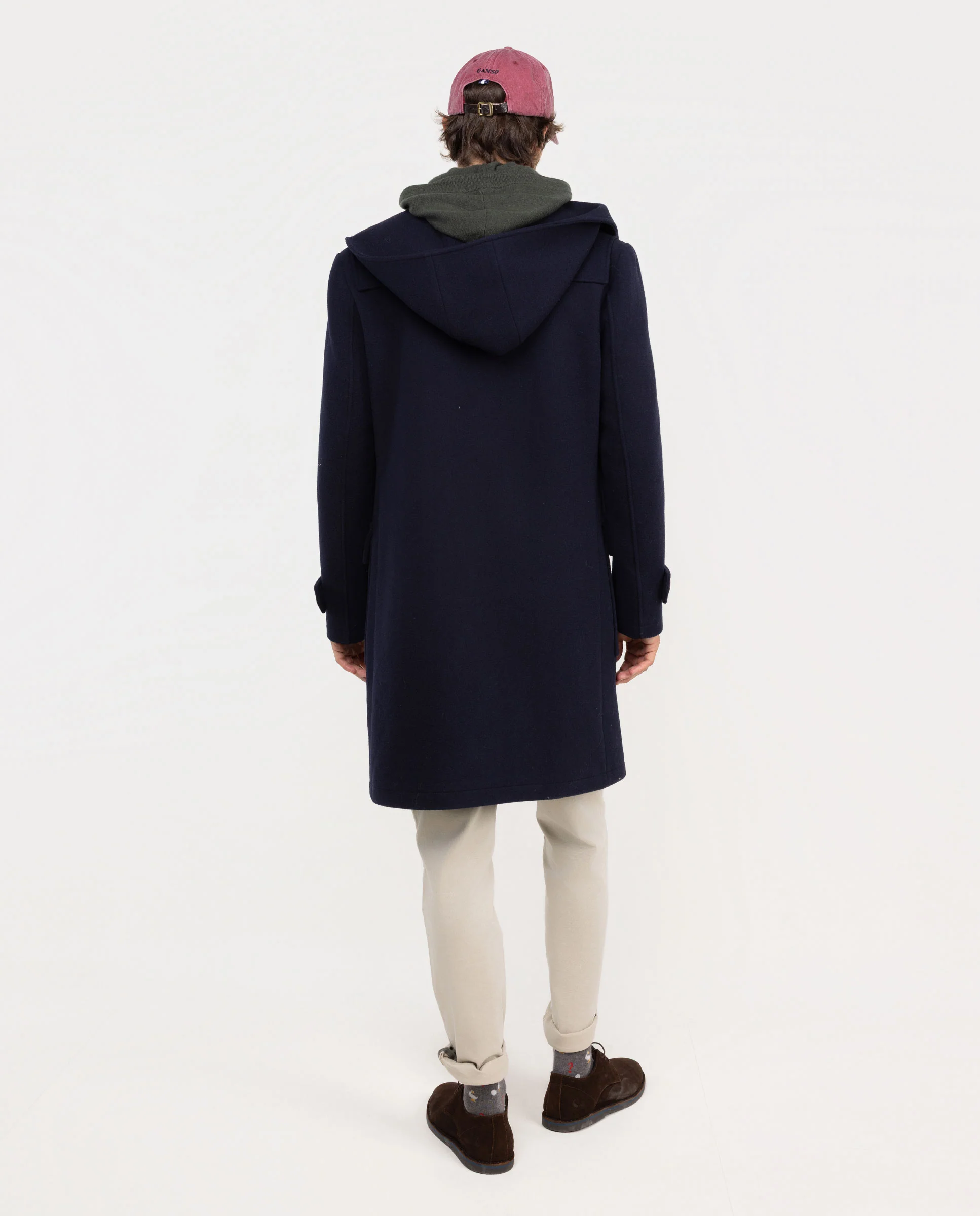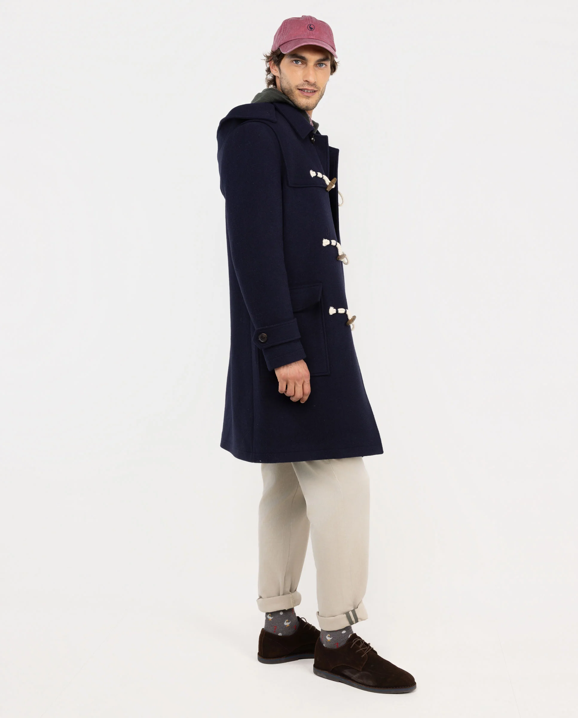 Trenca de hombre de lana Marino, confeccionado en mezcla de lana con acabado repelente al agua. Capucha con detalles de bandera en el interior. Dos bolsillos grandes de parche y solapa. Manga larga con trabillas en los puños. Cierre con alamares, cremallera y botón en el cuello. Forro interior guateado y vistas desmontables también guateadas.