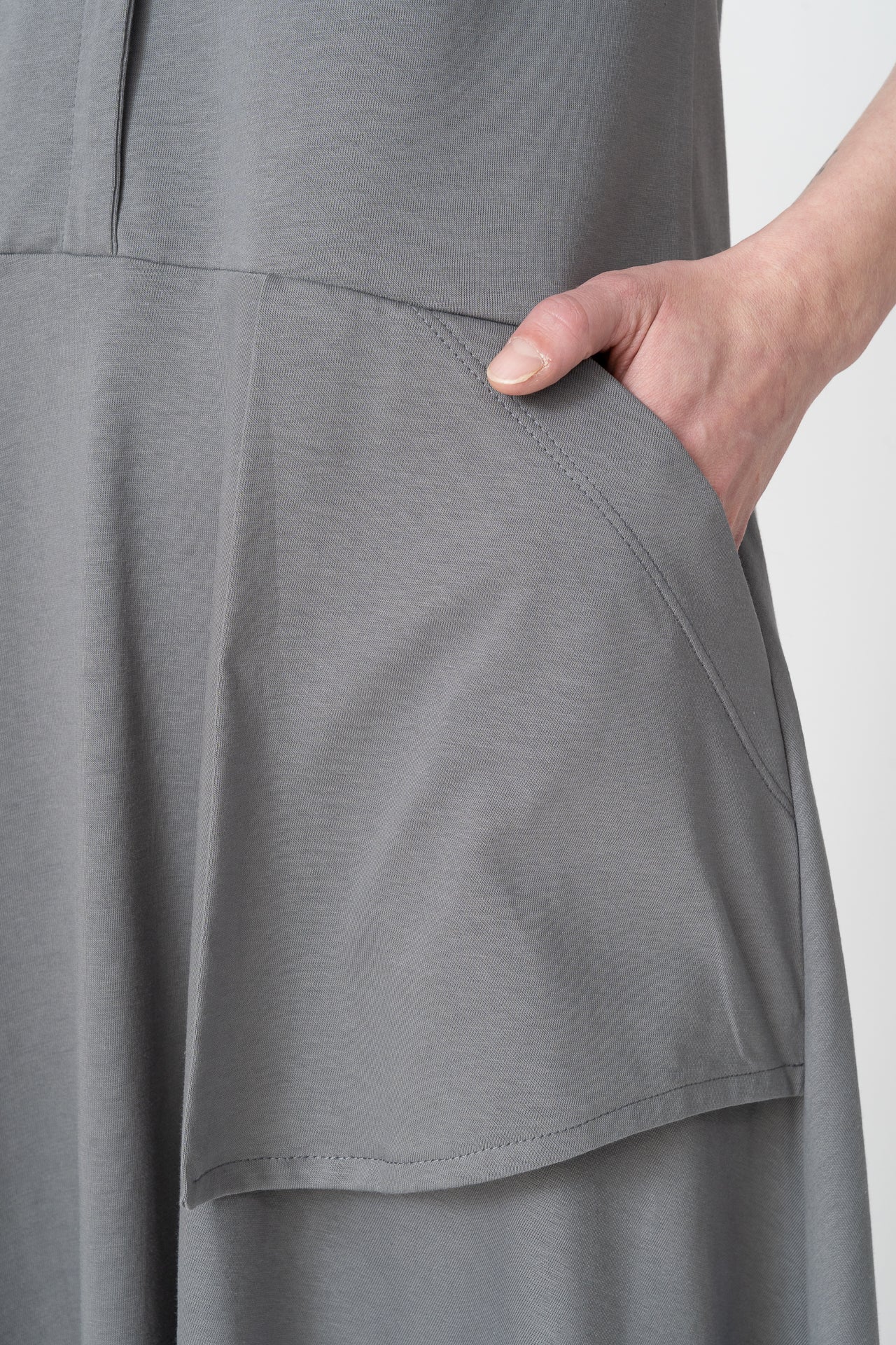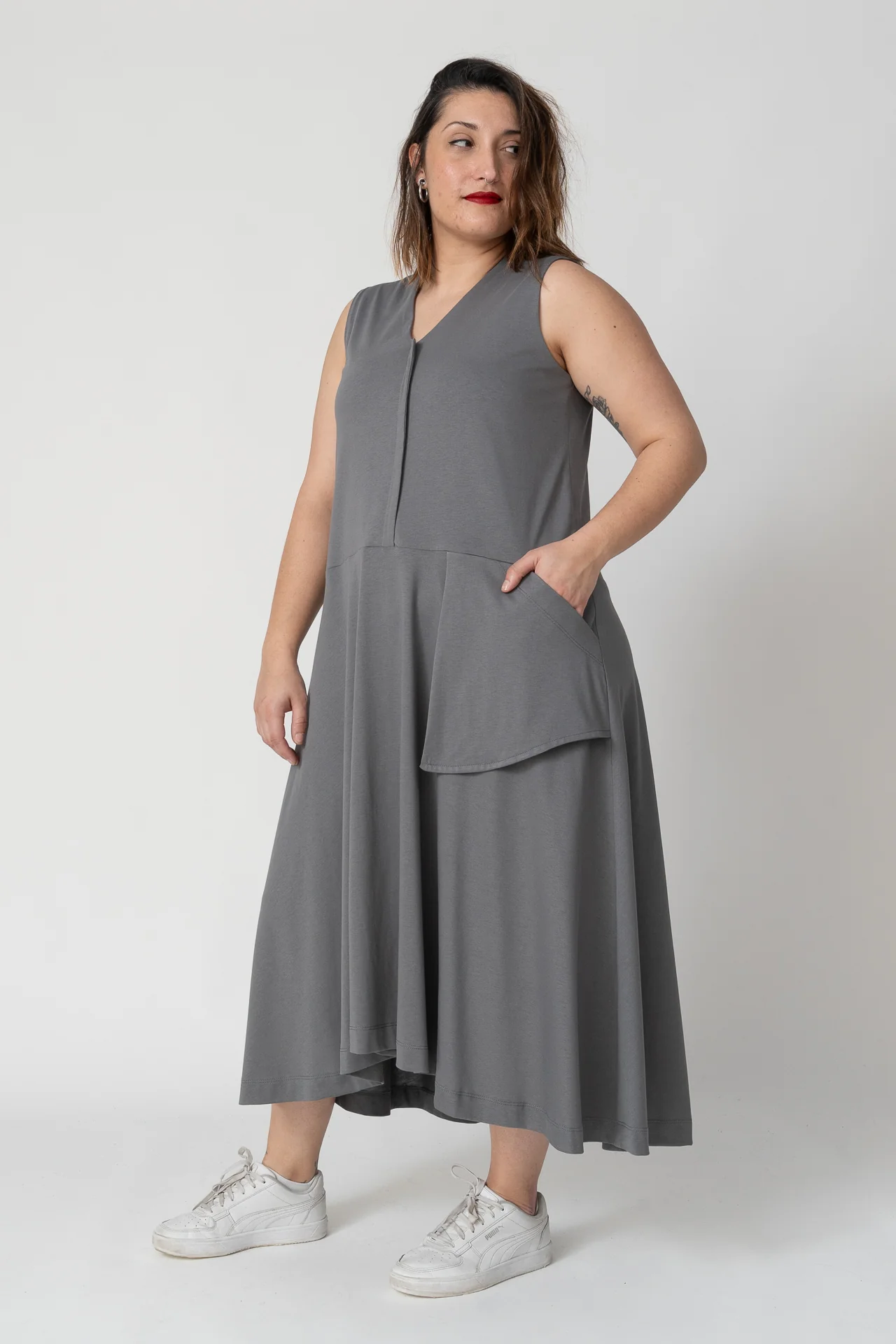 Vestido doble cuerpo de tirantes con pestaña, falda de capa con un bolsillo en el lado izquierdo. Muy agradable y cómoda de llevar.Diseñado por Elisa Muresan. Patronaje y confección a mano en Zaragoza en nuestro propio taller.