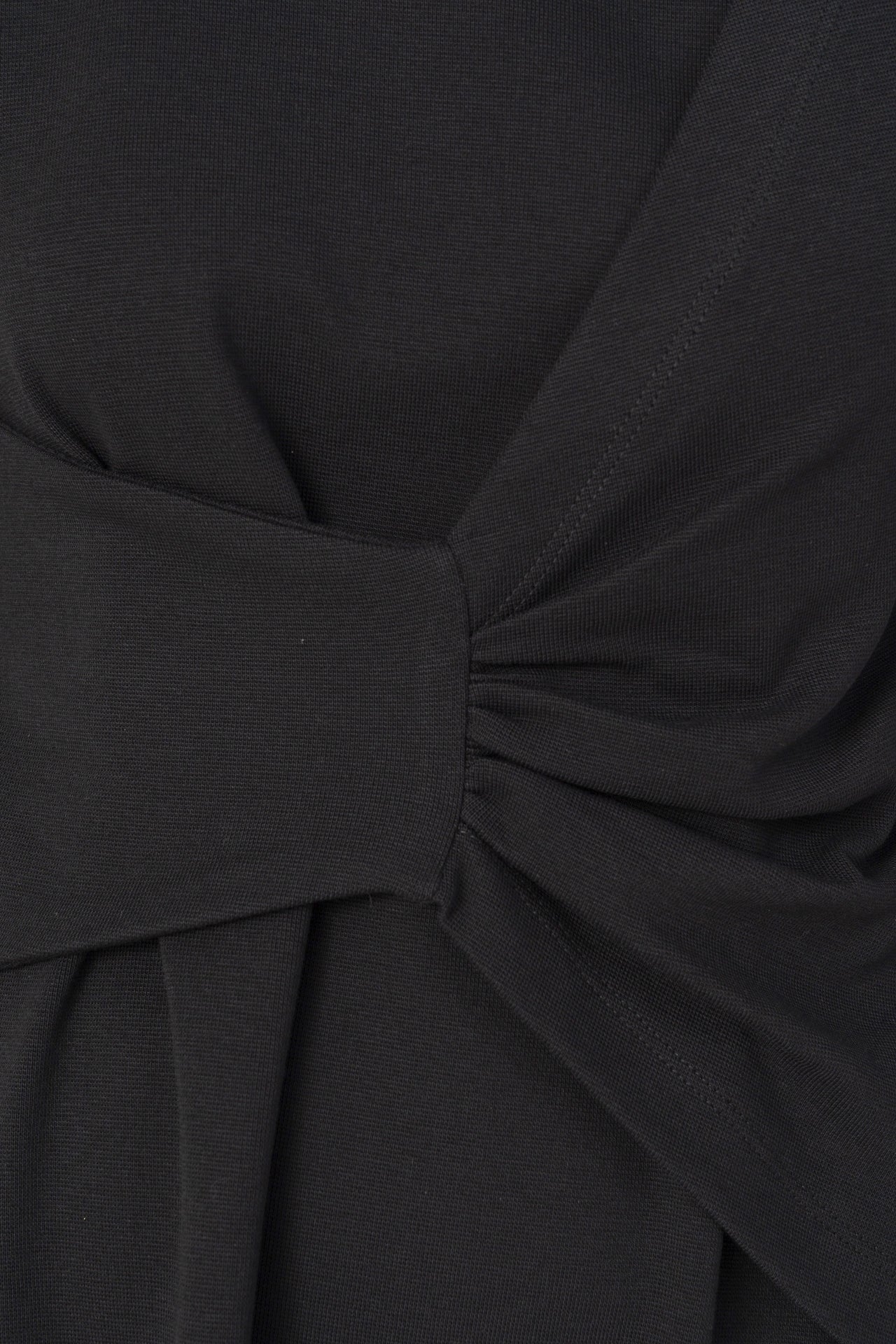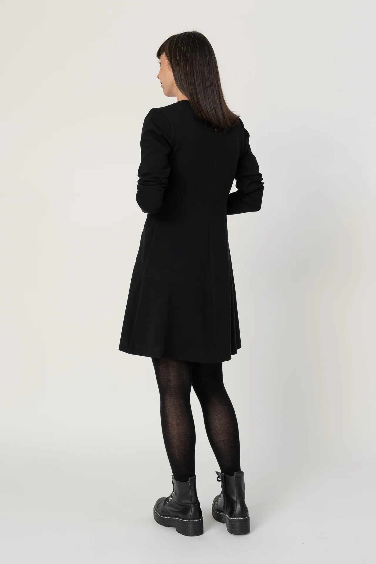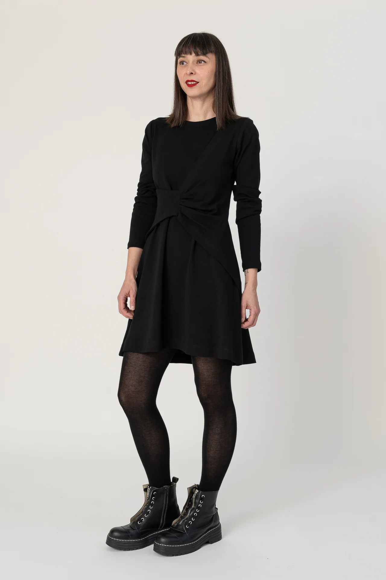 Vestido corto de tipo A, manga larga y drapeado. Muy agradable y cómodo de llevar. Diseñado por Elisa Muresan. Patronaje y confección a mano en Zaragoza en nuestro propio taller.