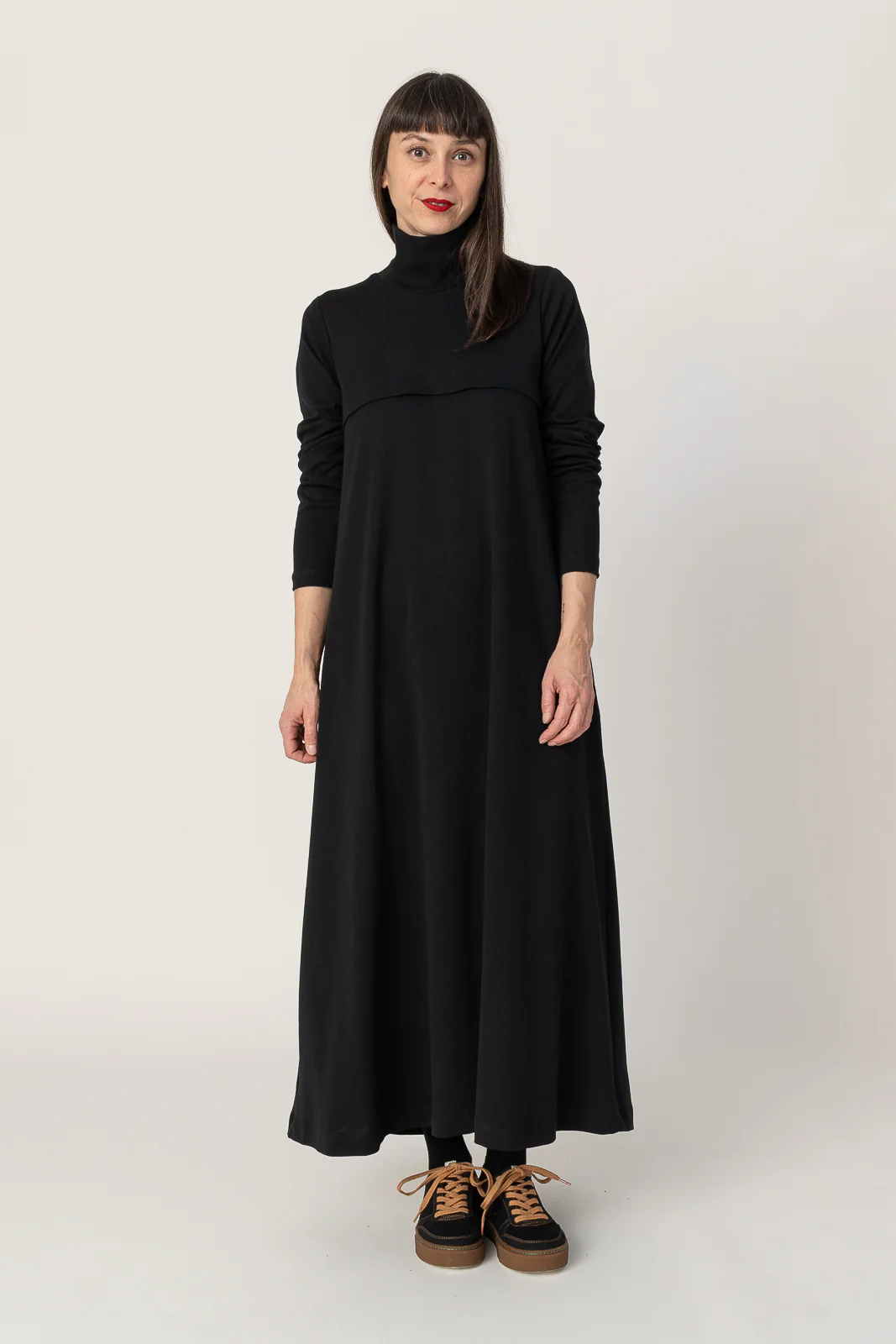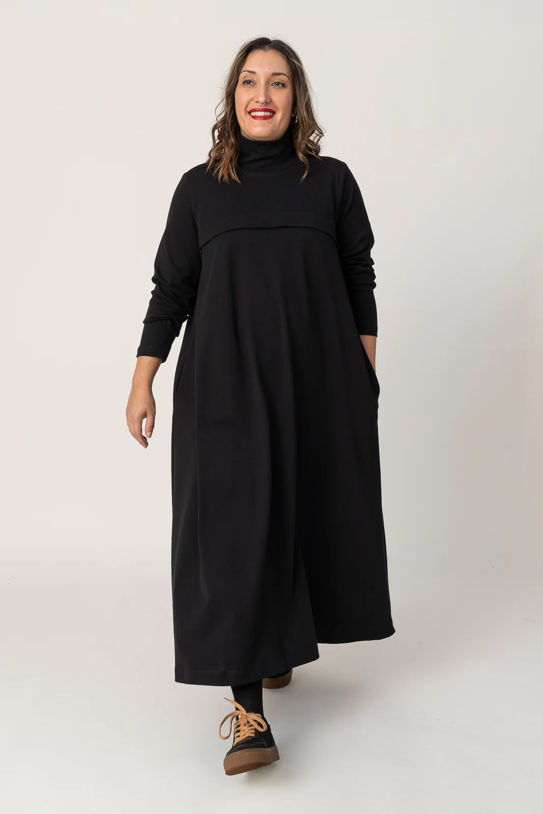 Vestido largo de capa con bolsillos laterales y detalle en el delantero. Muy agradable y cómodo de llevar. Diseñado por Elisa Muresan. Patronaje y confección a mano en Zaragoza en nuestro propio taller.
