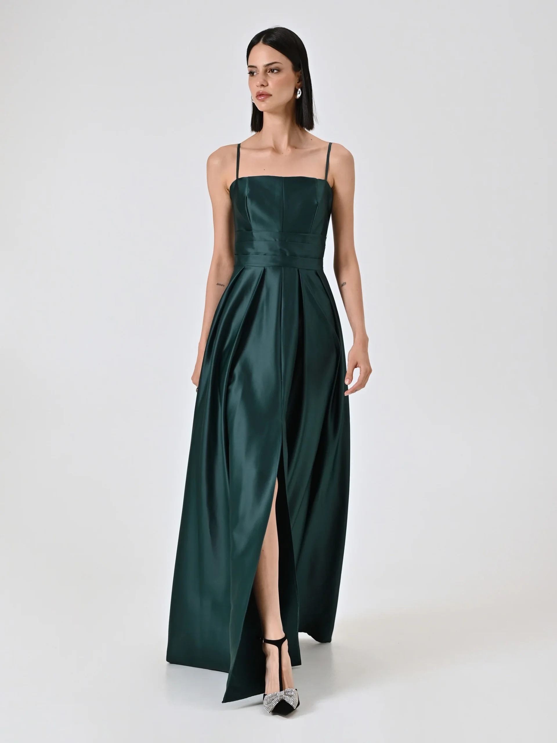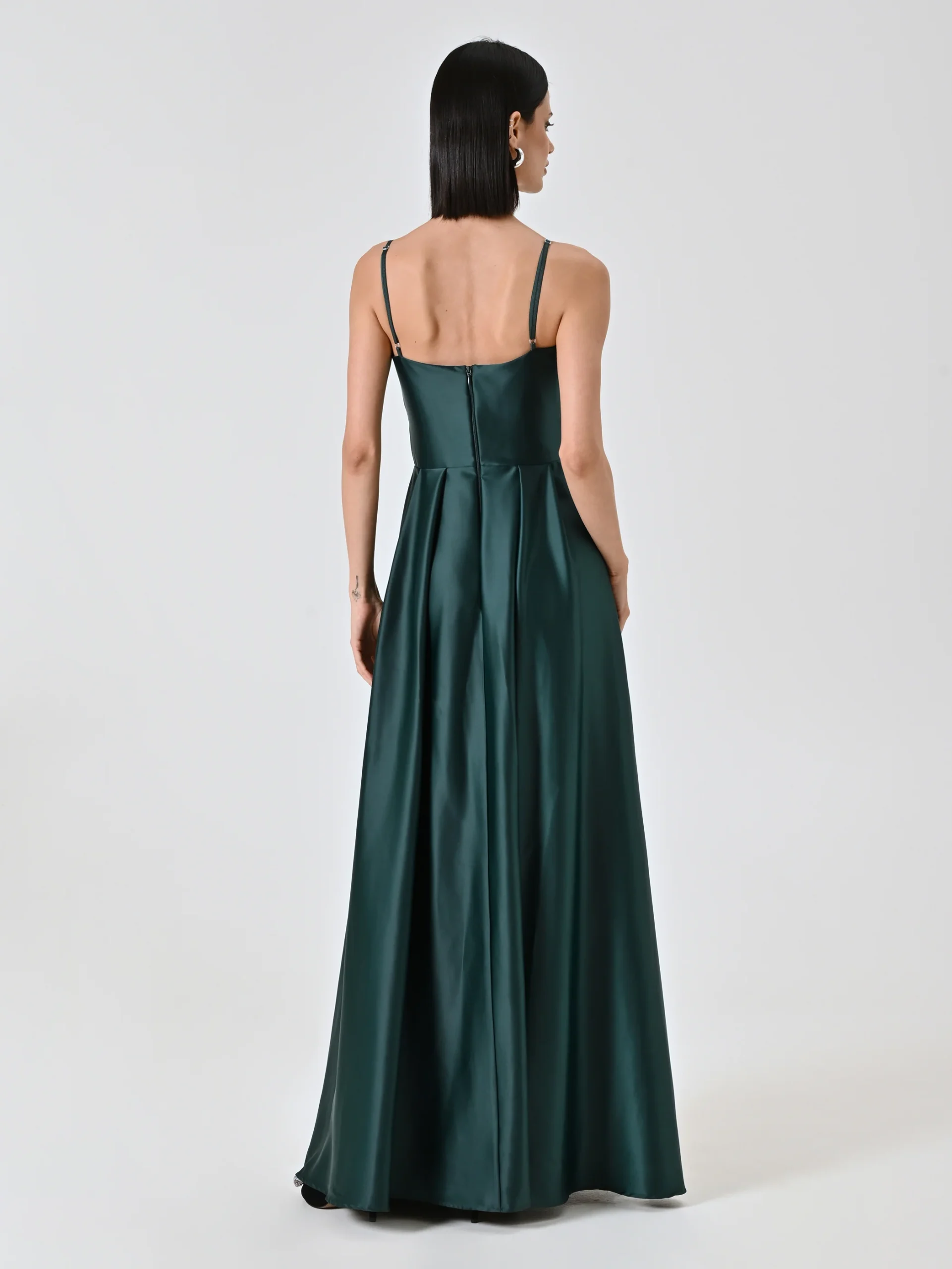 Su confección en satén verde brillante presenta un cuerpo drapeado con tirantes finos y una falda amplia que se desliza con dulzura. El cierre trasero mediante cremallera garantiza un fit impoluto a la vez que lineal.